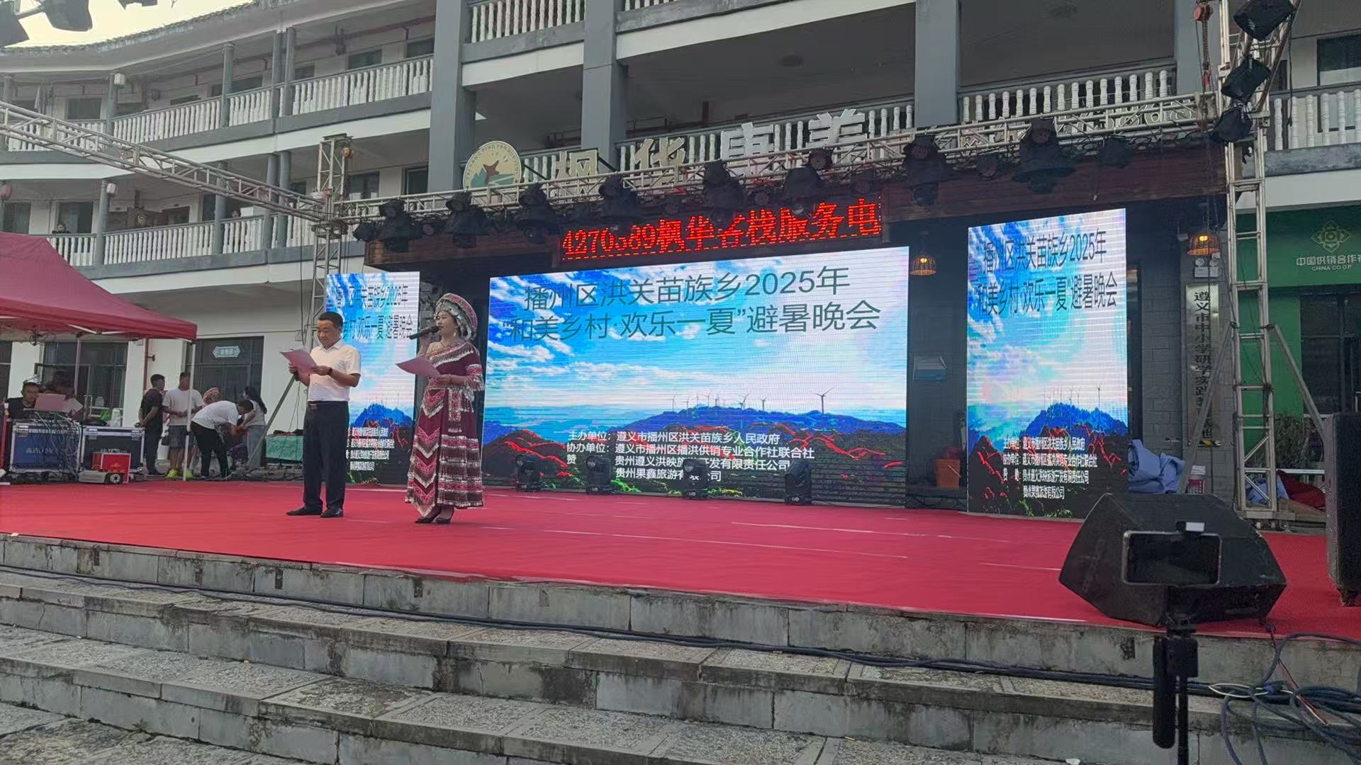 夜幕降临,避暑晚会如期而至,晚会分为颁奖、文艺演出、篝火晚会三部分。晚会在苗乡风采展示中拉开帷幕,身着传统苗族服饰的苗家儿女踏着明快节奏走上舞台,向观众们展示农特产品、传统农具以及手工艺品,瞬间点燃了现场气氛。随后,由当地村民表演的具有民族特色的舞蹈《苗乡侗寨》、避暑游客带来的《太湖美》《精忠报国》等晚会节目轮番上演,给观众带来一场视听盛宴,赢得现场阵阵掌声。此外,晚会上还穿插了民宿招商推介环节,通过短片展示洪关苗族乡的自然风光与民宿资源,淳朴的民风、凉爽的气候、独特的民族文化吸引不少避暑游客流连忘返。