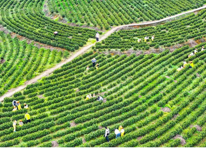 春和景明,茶香满园。在播州区泮水镇永定村的生态白茶基地里,1200余亩白茶嫩芽争先吐露芳香,茶农们腰挎竹篓,穿梭在茶垄间,手指翻飞间,一颗颗饱含春意的鲜嫩茶芽落入篓中,勾勒出一幅生动的春日采茶图。